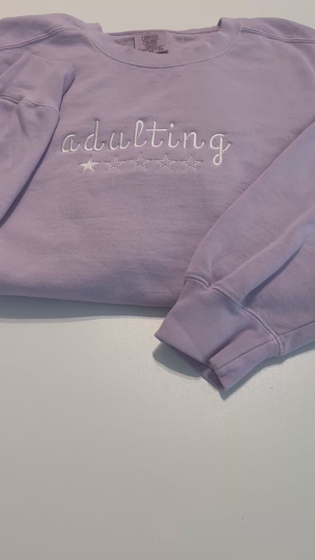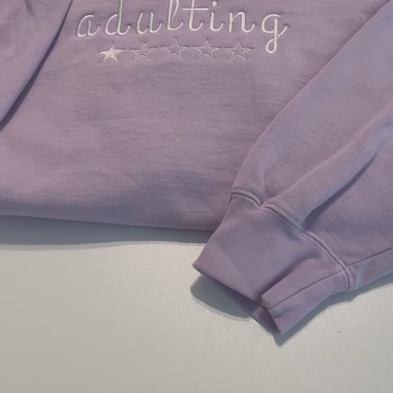 This soft Comfort Colors crew neck sweatshirt, made from ring-spun cotton, humorously highlights the struggles of adult life with its witty "adulting" message. Available in sizes S through 3XL, it combines comfort with a playful nod to grown-up challenges.