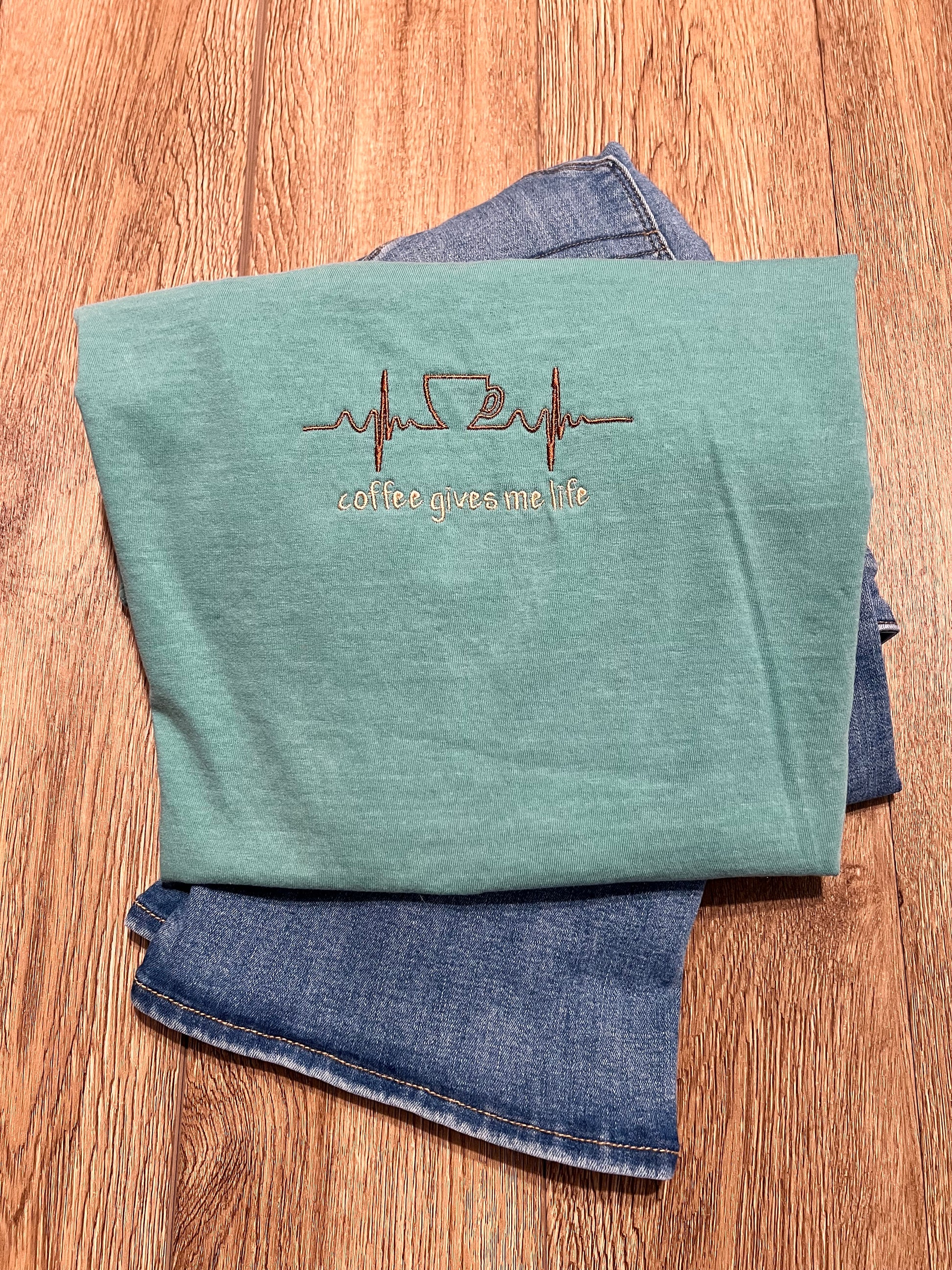 This Comfort Color t-shirt is crafted from 100% ring-spun cotton, ensuring a soft and durable wear. It features an expertly embroidered EKG heartbeat design with a coffee cup at its center, accompanied by the tagline "Coffee Gives Me Life." Ideal for coffee enthusiasts, this shirt combines comfort with a stylish nod to your favorite daily ritual
