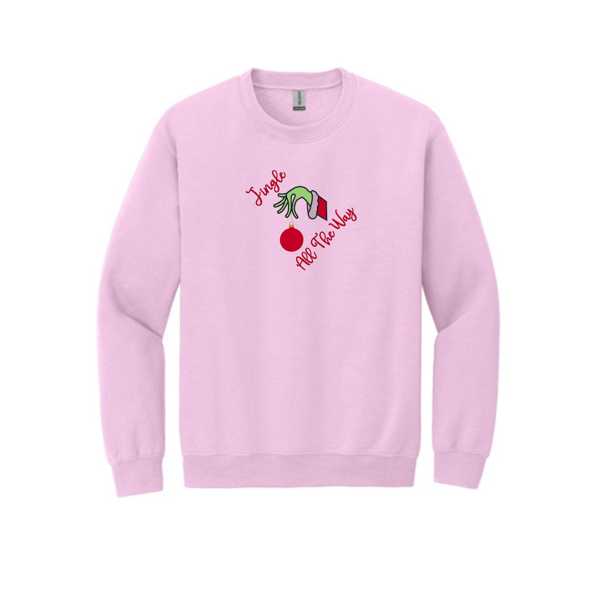 This adorable sweatshirt is a Gildan Heavy Blend Crewneck Sweatshirt with an embroidered Grinch hand holding a ornament and the words 'Jingle All The Way'.
