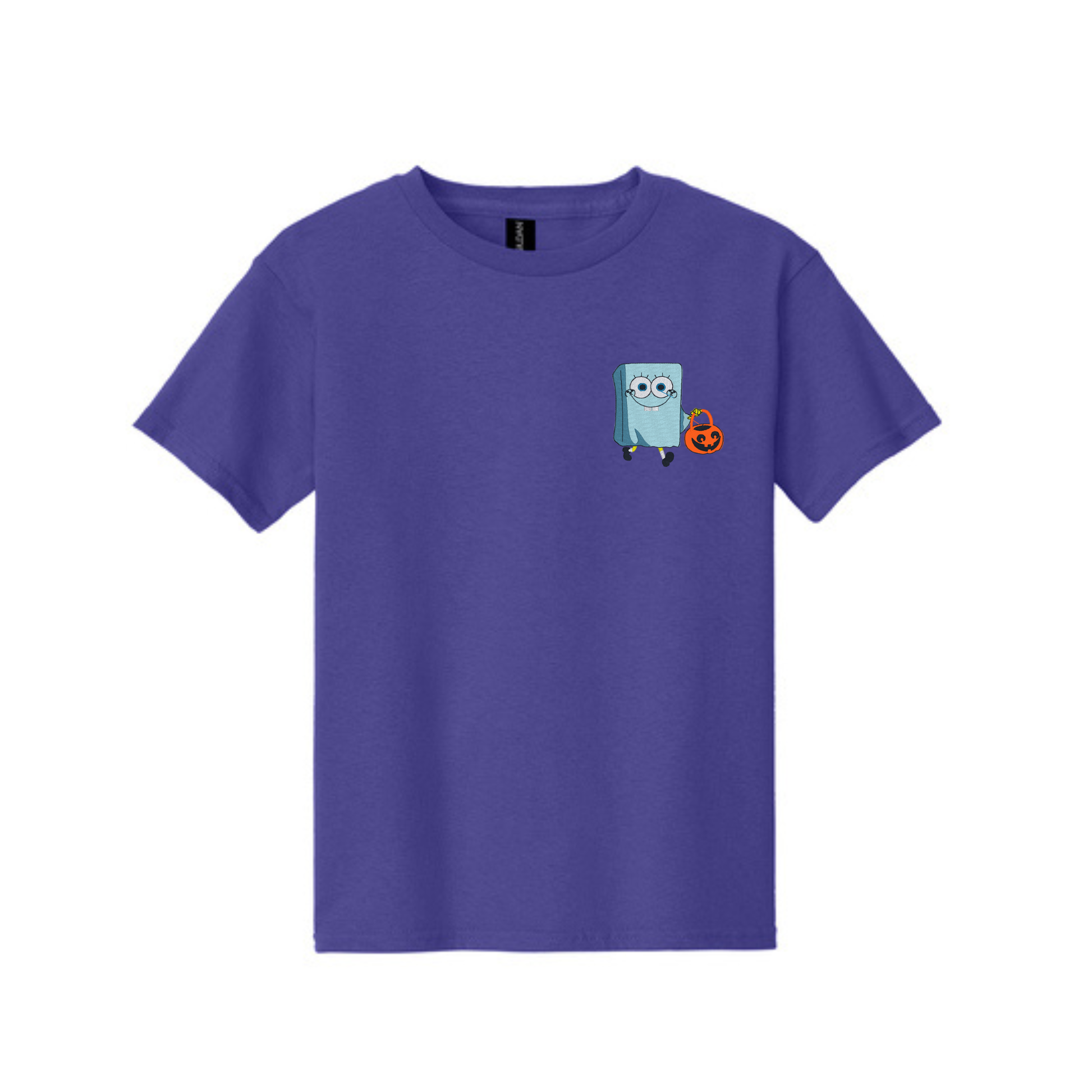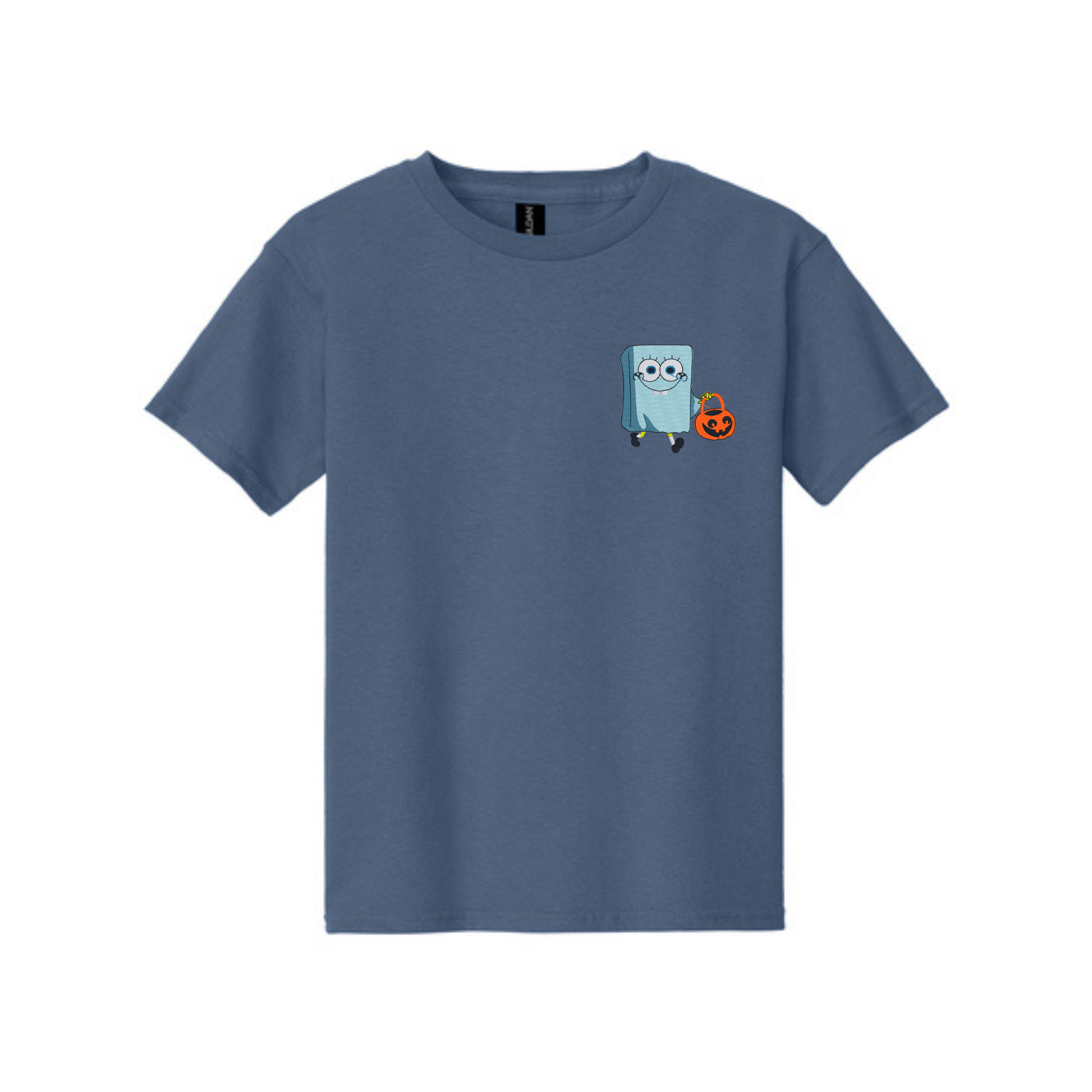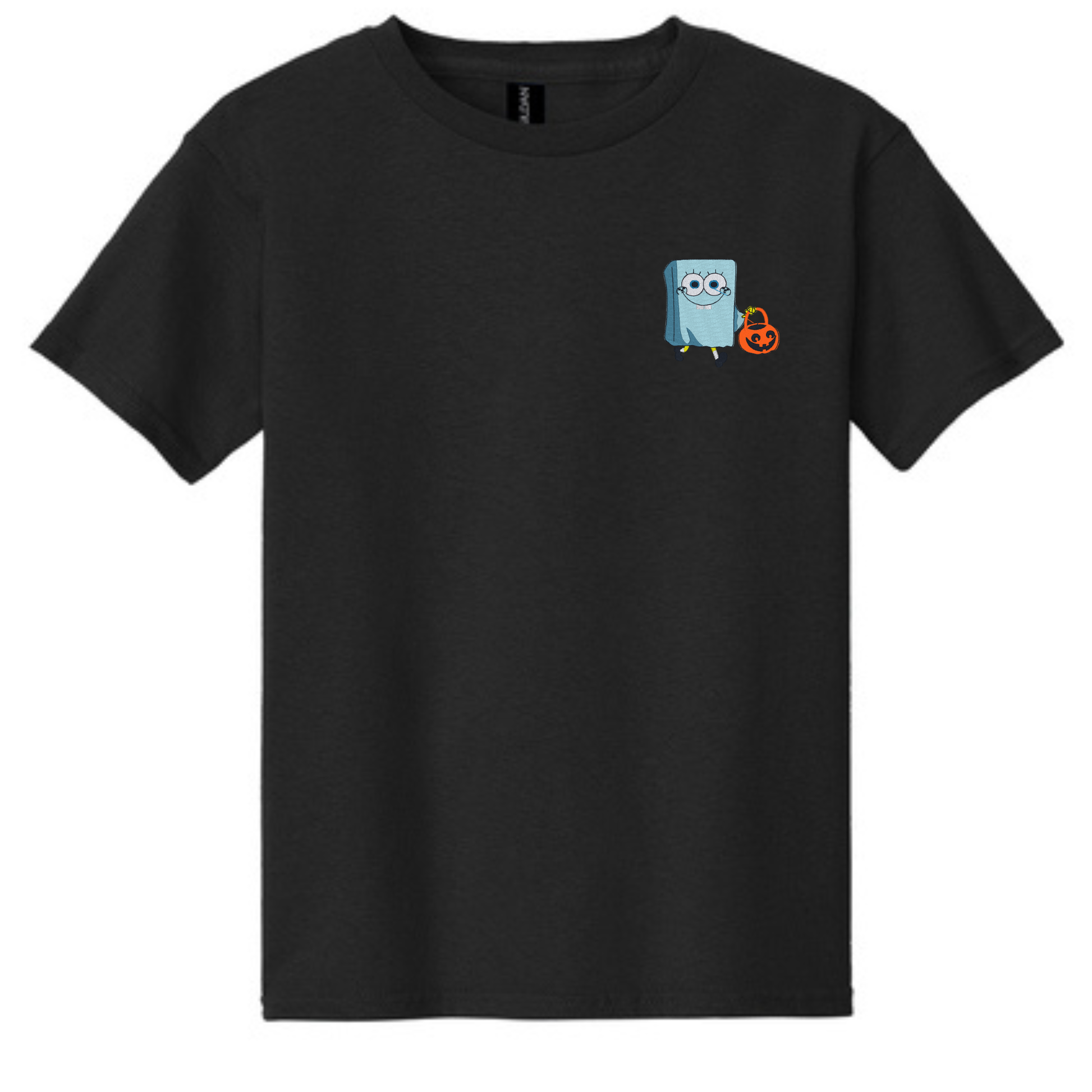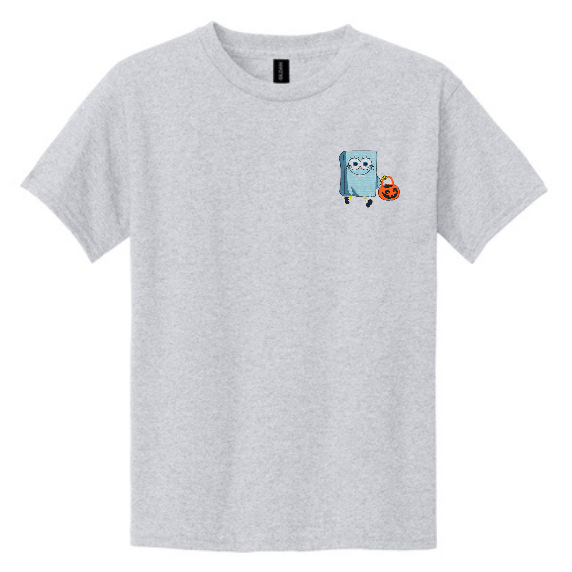 Fun Halloween t-shirt featuring SpongeBob dressed up as a ghost for trick or treating.
