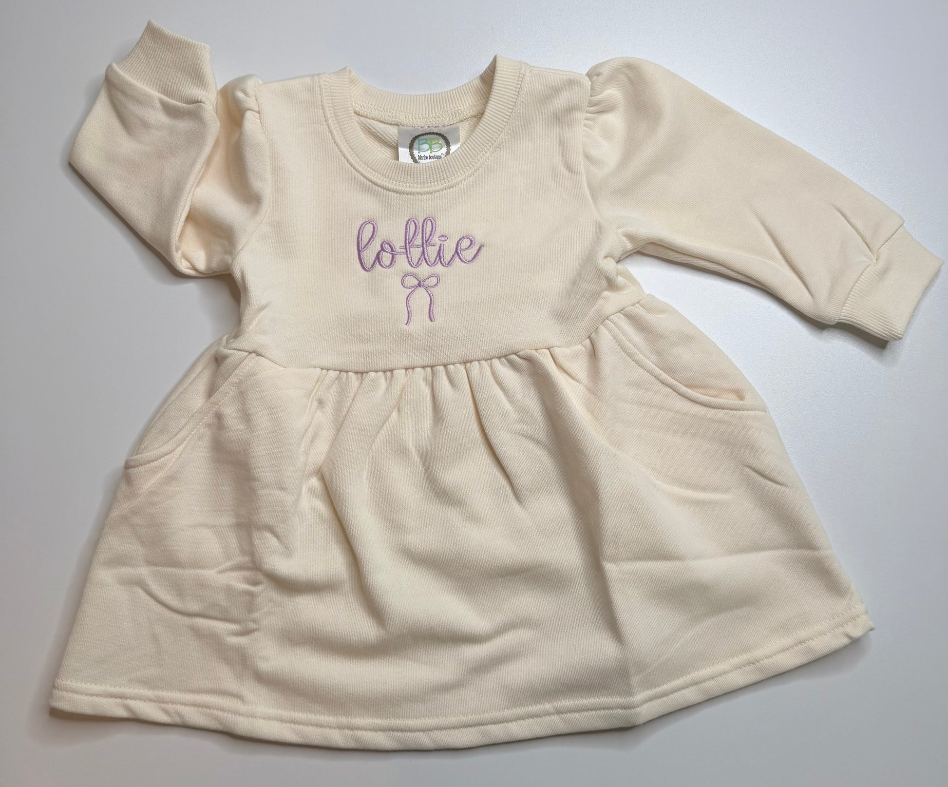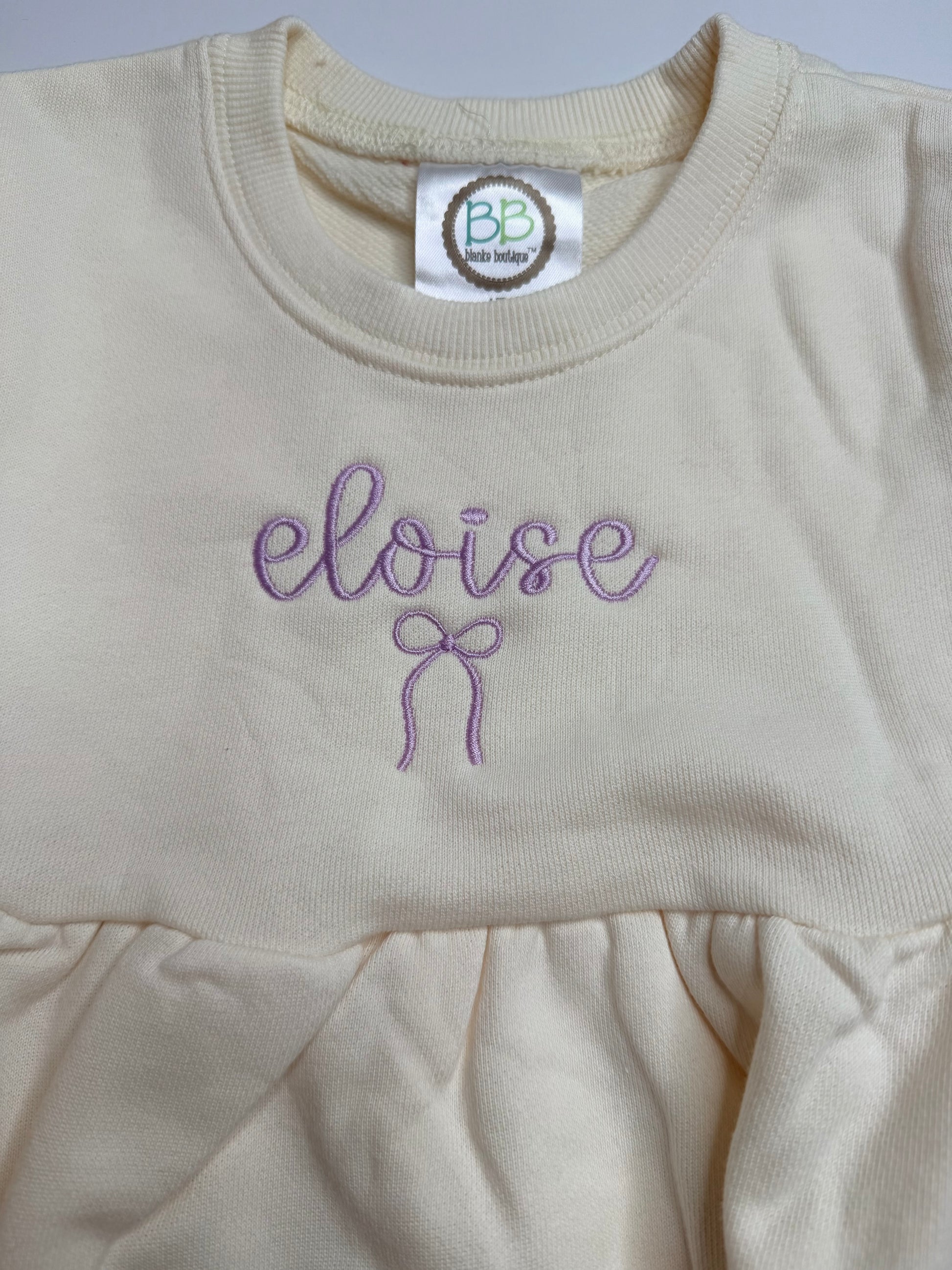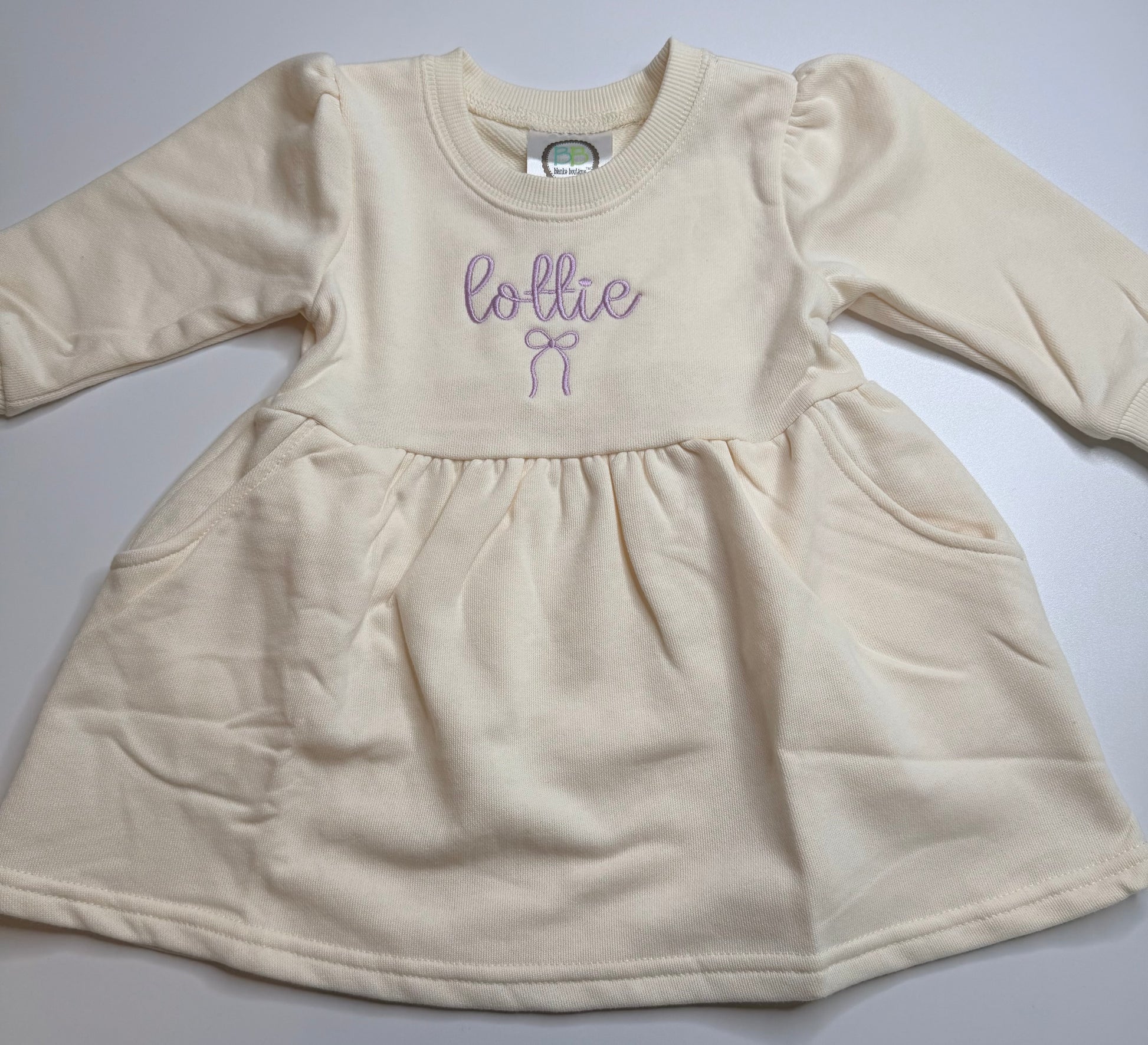 This adorable embroidered girls dress is the perfect outfit for Easter, Birthdays, Sibling Photo Shoots, Sunday Church or anytime. This dress is available in a fleece sweatshirt long sleeve option or a short sleeve ruffle empire waist option. Both are soft, comfortable and so cute on! The dress is personalized with your child's name in a sweet all lowercase script font with a bow. The short sleeve empire waist dress is available in a variety of colors ( Lavender, Mint, Light Blue, Yellow, Coral and Pink). The Sweatshirt dress is only available in 4 colors (Cream, Grey, Pink and Red). All are offered with 4 thread color choices. Should you be interested in a different thread color, please message us. We are happy to work with you to find the color combination you are looking for. Images shown feature the Cream Sweatshirt Dress with Lavender Thread.